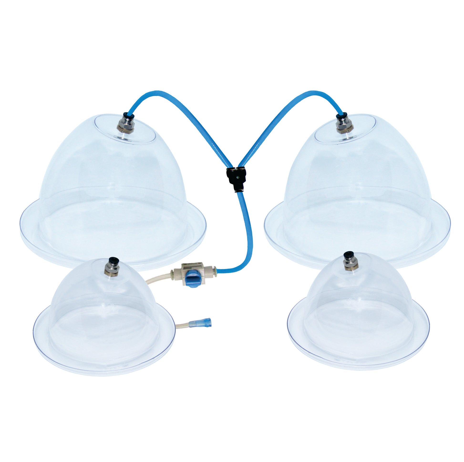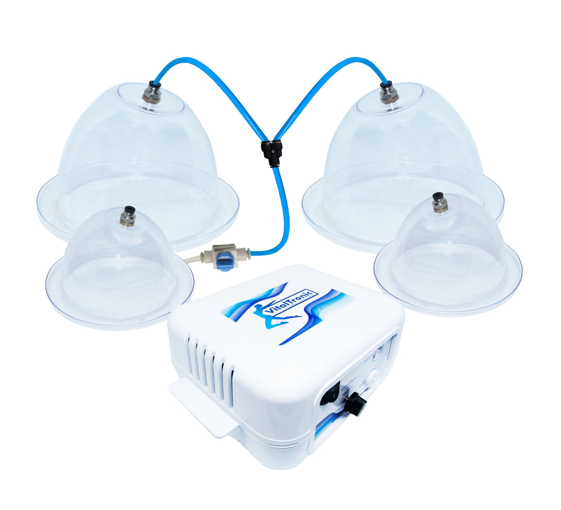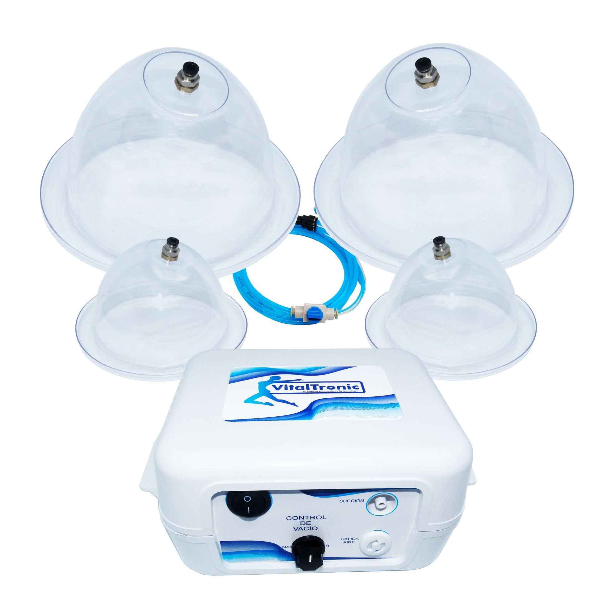 Equipo Vacumterapia VitalTronic para aplicaciones de Vacumterapia en glúteos. Incluye dos copas, talla XXL de 21cm de diametro externo y 16cm de diametro interno, la medida asignada apunta su funcionamiento a caderas de 91cm o menos, además de dos copas, talla L, de 10 cm diámetro interno y 13 cm de diámetro externo, para bustos y abdomen. Las mismas se componen de material sintetico cristal de alto compacto e indeformables.