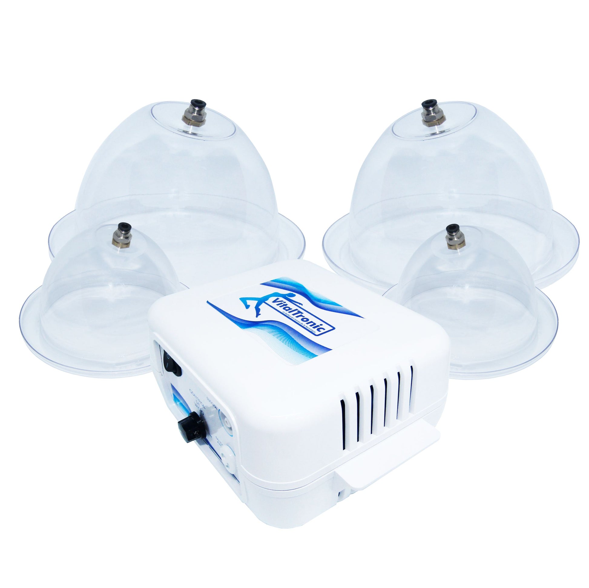 Equipo Vacumterapia VitalTronic para aplicaciones de Vacumterapia en glúteos. Incluye dos copas, talla XL de 13cm de diametro interno, la medida asignada apunta su funcionamiento a caderas de 91cm o menos, además de dos copas, talla L, de 10 cm diámetro interno, para bustos y abdomen.