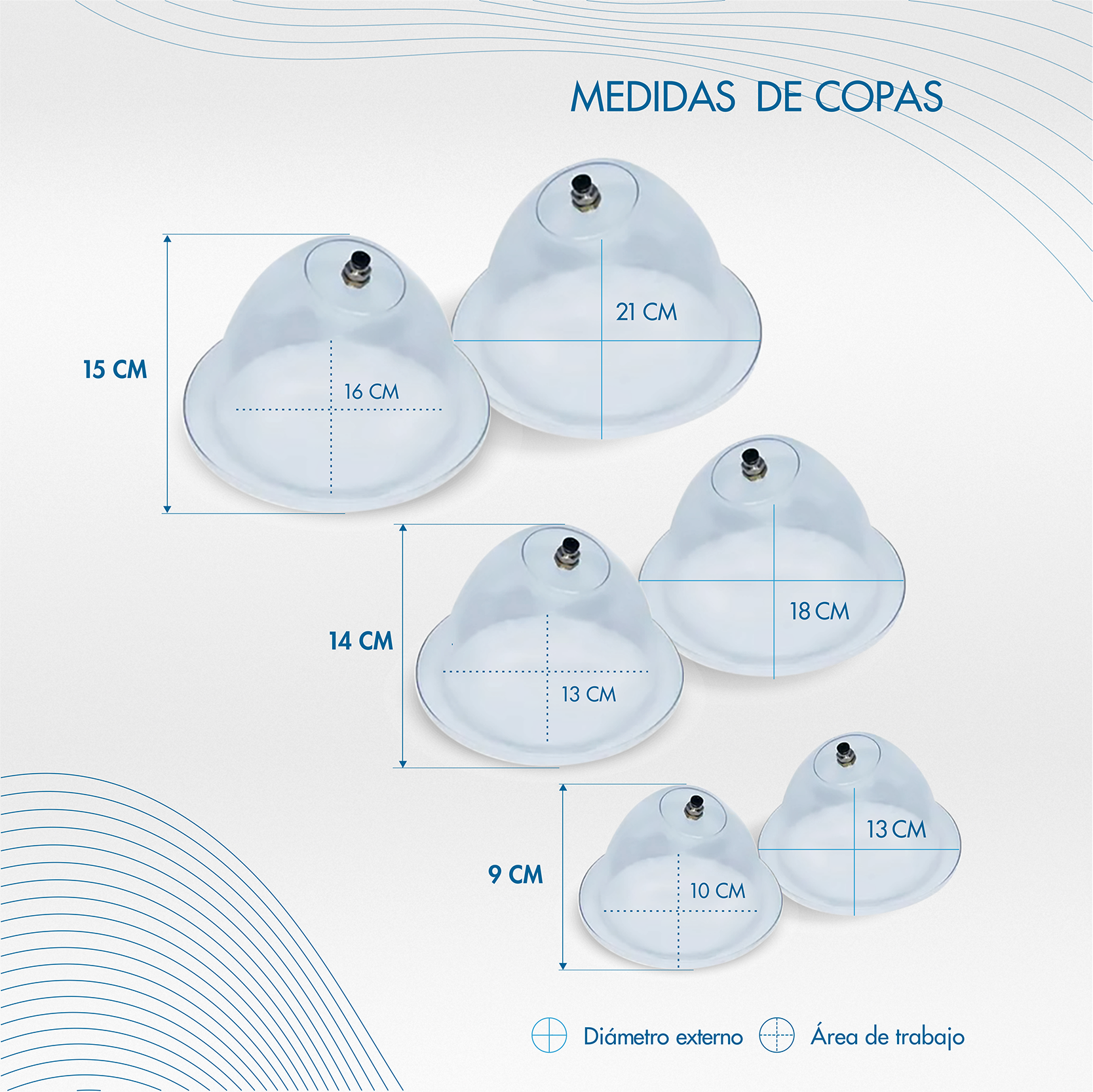 Transforma tus tratamientos estéticos con este Kit de Vacumterapia VitalTronic. Incluye dos copas de 16cm de diámetro interno + dos copas de 13cm de diámetro interno + dos copas de 10cm de diámetro interno, fabricadas en material sintético cristalino de alta resistencia e indeformables.